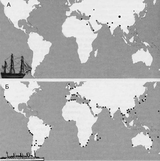 Схема распространения очагов чумы в мире по В. Н. Федорову, В. П. Козакевичу (1959). А — до начала третьей пандемии чумы с 1846 г. по 1894 г. Б — в начале третьей пандемии с 1894 г. по 1903 г. Любопытный образчик конъюнктурного искажения научной информацию в угоду господствующей в эпидемиологии чумы концепции. Проигнорированы предшествовавшие «третьей пандемии» вспышки чумы в горных долинах китайской провинции Юнъ-нан (о них было известно уже не менее 50 лет!), в Индии, Курдистане, Афганистане, Северной Персии, Астраханском крае, Месопотамии, в центральной Танзании и Уганде, в Маньчжурии, Забайкалье и в др. местностях. И куда только они делись с карты с началом «третьей пандемии»? Схема взята из источника 2006 г., где приведена как «образец научности» схемы «грызун-блоха-грызун».